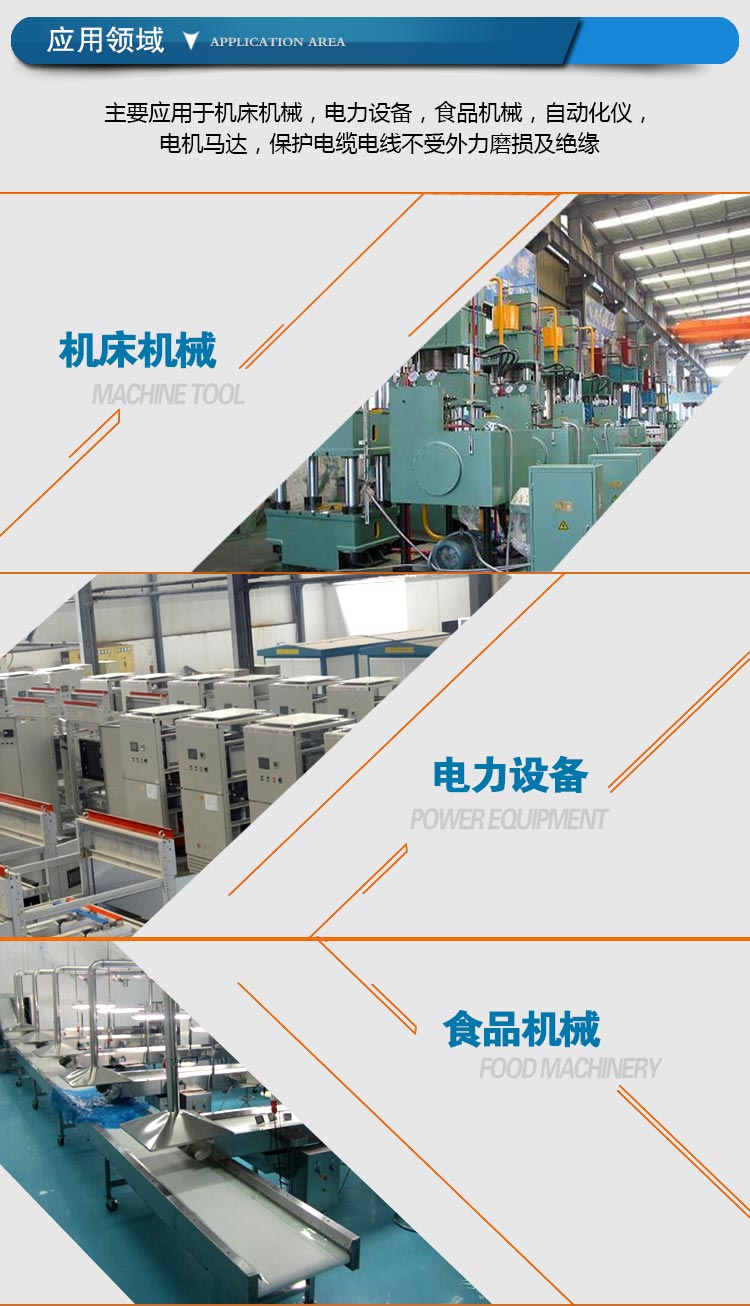 產(chǎn)品應用: 可用于機床機械,電力設備,食品機械,自動化儀, 電機馬達,保護電纜電線不受外力磨損及絕緣