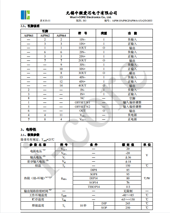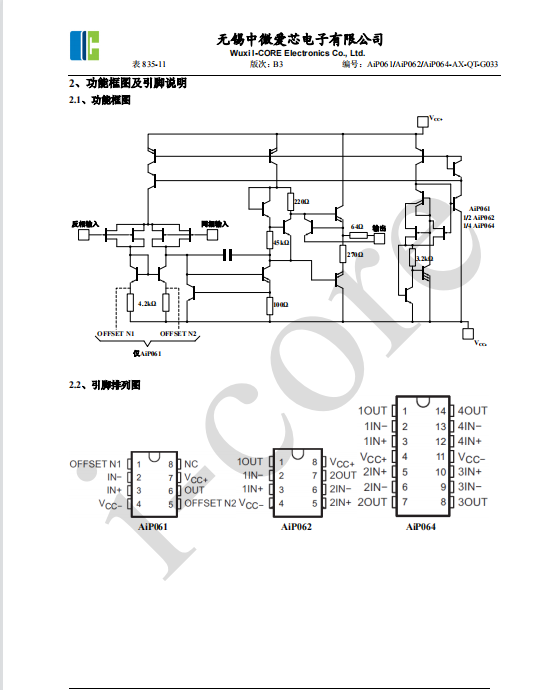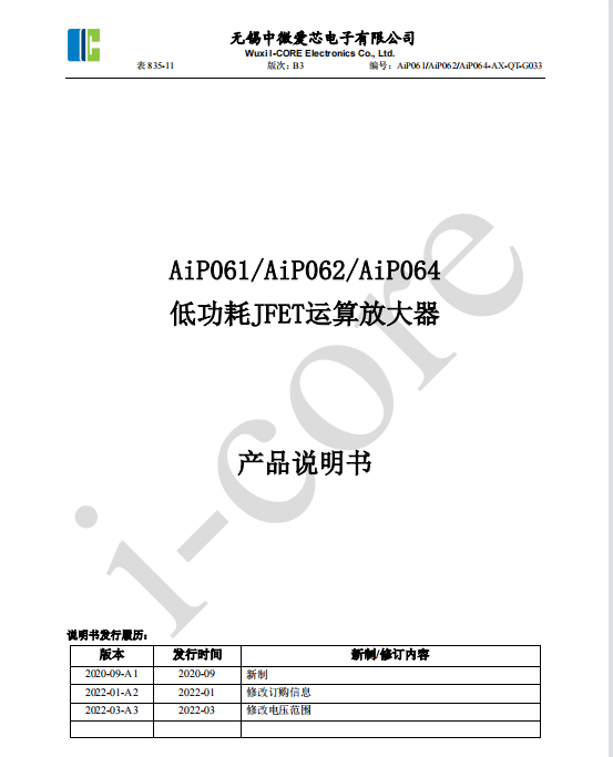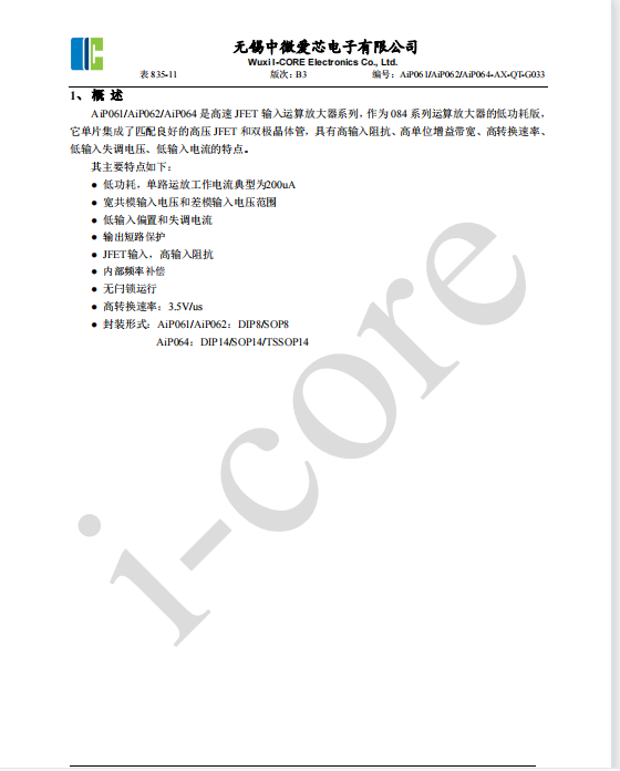 AiP061是高速JFET輸入運(yùn)算放大器系列,作為084系列運(yùn)算放大器的低功耗版,它單片集成了匹配良好的高壓JFET和雙極晶體管,具有高輸入阻抗、高單位增益帶寬、高轉(zhuǎn)換速率、低輸入失調(diào)電壓、低輸入電流的特點(diǎn)。