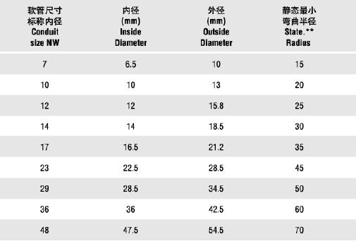 型號(hào) 軟管尺寸標(biāo)稱內(nèi)徑 內(nèi)徑 外徑 靜態(tài)最小彎曲半徑